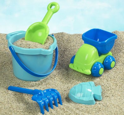 Small World Express. Outdoor Play: Big fun in the great outdoors! An adorable blue and green plastic set that has everything your little tyke needs for big time beach fun! Includes: a rake, shovel, sand mold, mini dump truck and a sand bucket to hold everything. Just add sand and water and get ready for giggles to begin! For ages 18 month and up.