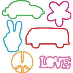 People everywhere are going crazy over Crazy Bands!! Crazy Bands are glow in the dark, made of 100% silicone and die molded in awesome shapes in a huge variety of colors! And best of all, Crazy Bands return to their original shape when you take them off your wrist! Crazy Bands come in a pack of 24 assorted colors and shapes. You may have heard of these Animal Shaped Rubber Band Bracelets -- but now you can have your own! Groovy Tie Dye Crazy Bands include a peace sign, flower, van, beetle, the word LOVE and a peace hand.