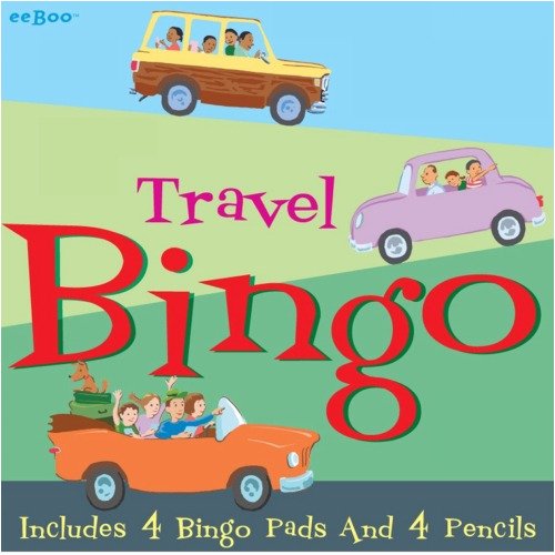 eeBoo Travel Bingo Game This is a perfect inexpensive traveling companion. Players mark off on their pads familiar objects that they pass while driving and the first person to get five in a row wins. Four pads with 20 play pages each plus four colored pencils are included. Comes packaged in a durable "slide-draw" box so the game will stay intact, even in the back of the car!